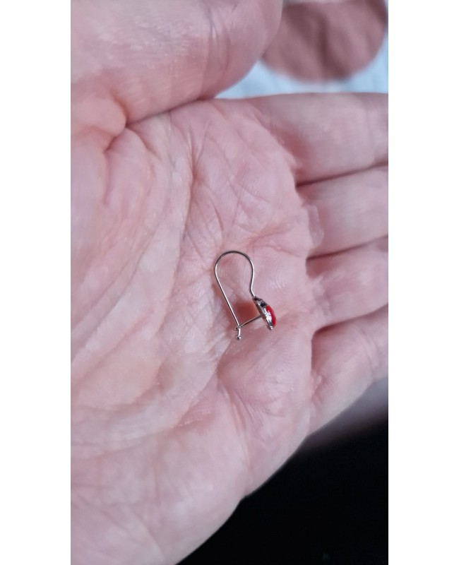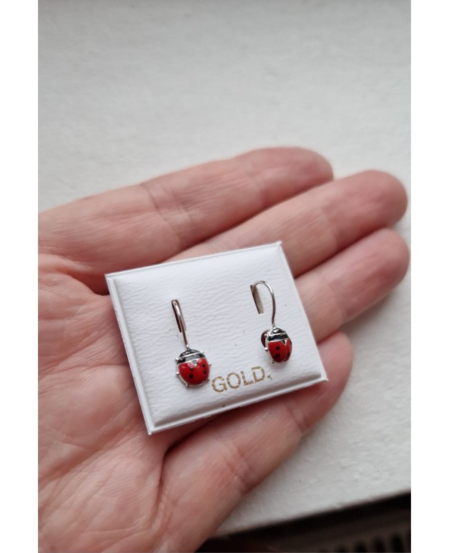 Bijuterii aur pentru copii, fetite si bebelusi - cercei de aur alb 14K cu tortite decorati cu gargarite de emal de culoare rosie.