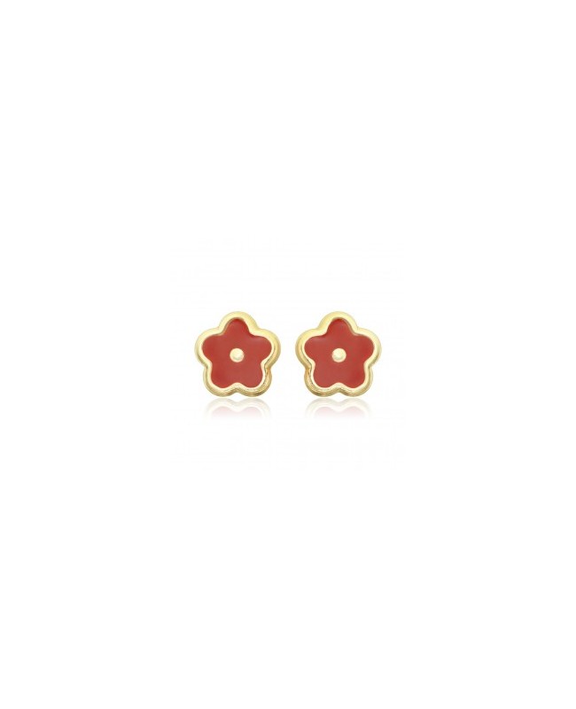 Cercei din aur galben 14K pentru nou nascuti/bebelusi, in forma de floricele de culoare rosie, emailate.