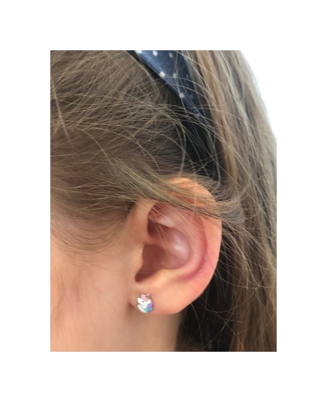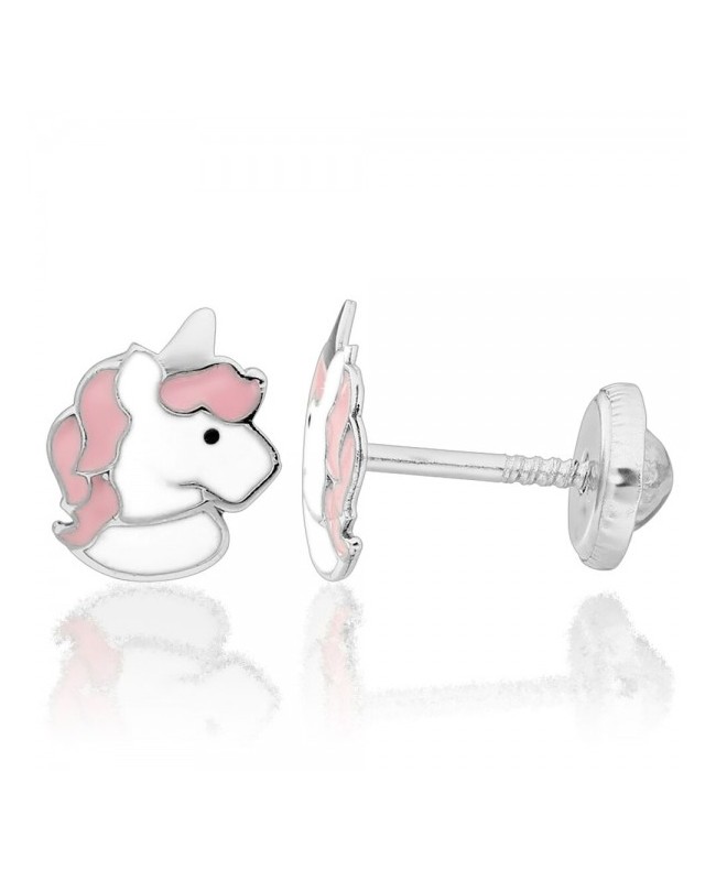 Cercei din aur alb 14K pentru copii, in forma de unicorni de culoare alb roz din email. Sunt prevazuti cu sistem special de inchidere, cu un capacel rotunjit care se insurubeaza pe tija, protejand pielea de sub ureche si prevenind pierderea.