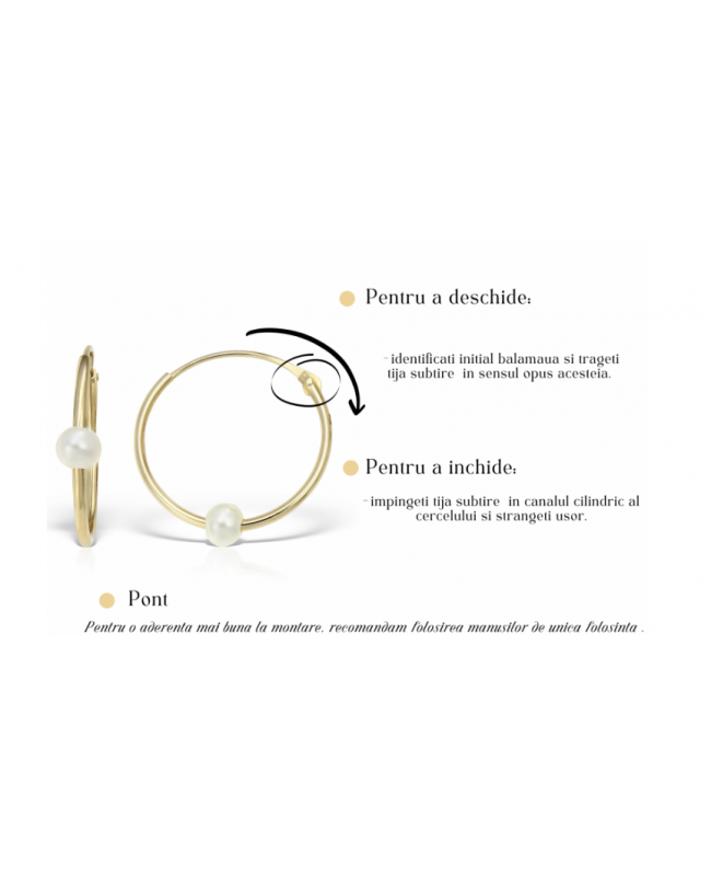 Creolele sunt o varianta optima pentru iubitorii de tortite; cerceii se deschid tragand tija subtire usor si cu grija in sensul opus balamalei si se inchid impingand tija usor in cilindru. Va rugam sa verificati instructiunile de montaj si intretinere pentru mai multe detalii (poza din detaliile produsului pe site).