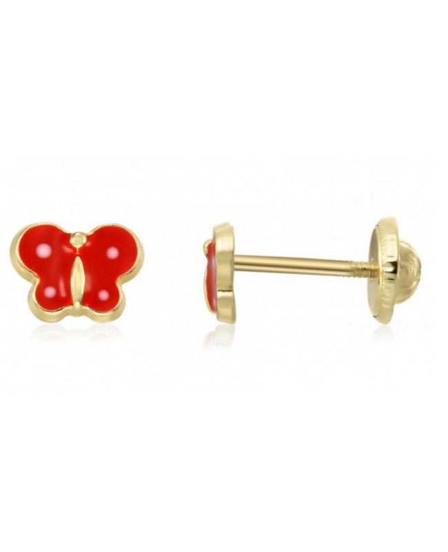 Cercei pentru copii din aur galben de 14K, in forma de fluturasi de culoare rosu, emailati. Cerceii sunt plini.