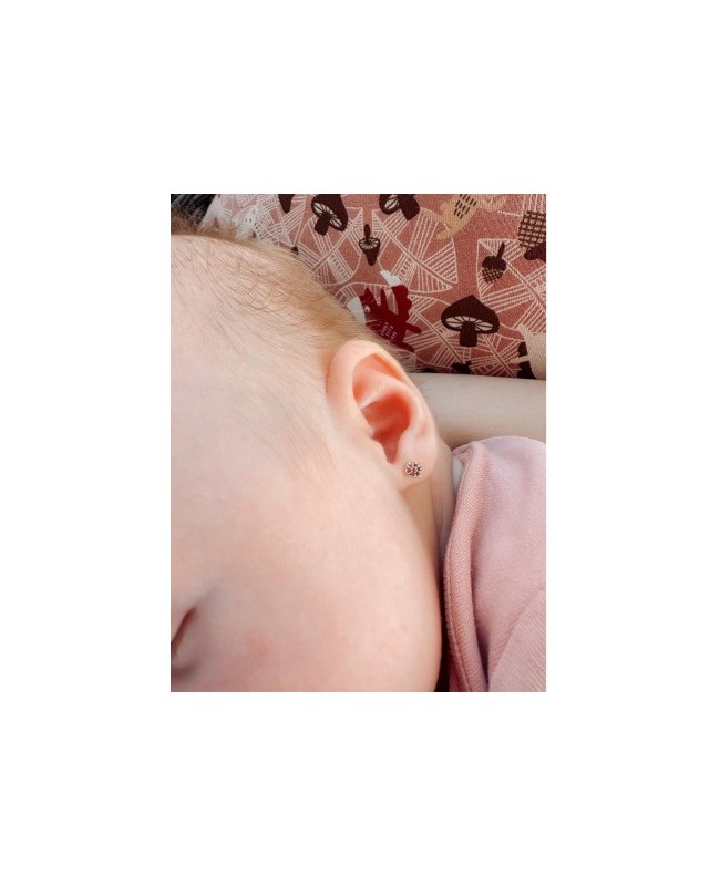 Cercei pentru copii, fetite, bebelusi/nou nascuti din aur galben de 14K, in forma de floricele de 5 mm cu 7 smaralde. Sistemul de inchidere este sigur, prin infiletare si cu capacel protector astfel incat poti lasa fetita sa doarma linistita, fara sa ai grija ca se va intepa in spatele urechii.