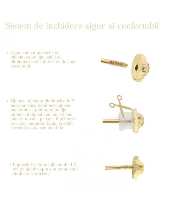 Cerceii sunt prevazuti cu sistem special de inchidere foarte sigur, capacel protector cu insurubare care protejeaza bebelusii si fetitele sa nu se raneasca sub urechiusa si impiedica pierderea.